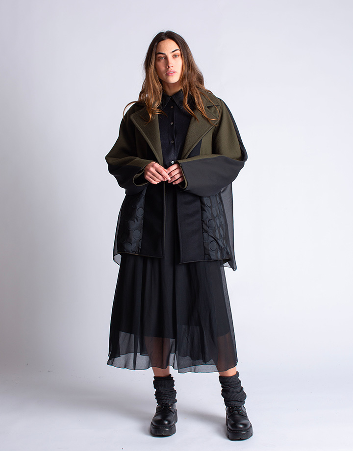 This reversible coat shows a feminin shoulders cut on the front while it is a wide kimono on the back. One side is monochromatic in soft army wool. The second side plays with the softness of the army wool and the lightness of black fluid georgette. Automatic buttons covered in fabric and sewn by hand.