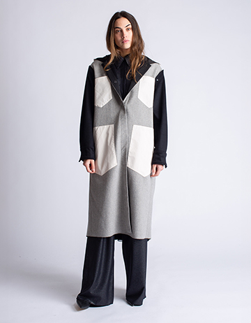 Reversible long vest with detachable sleeves and hood, perfect for any time and your travels. One side is simple, genderless with rigorous colors. The other side is irrational, the mix of feminine blacks is attractive. This model is born as a mix of different materials to Re-use deadstock fabrics. Closure with automatic buttons covered in waste fabric and sewn by hand.